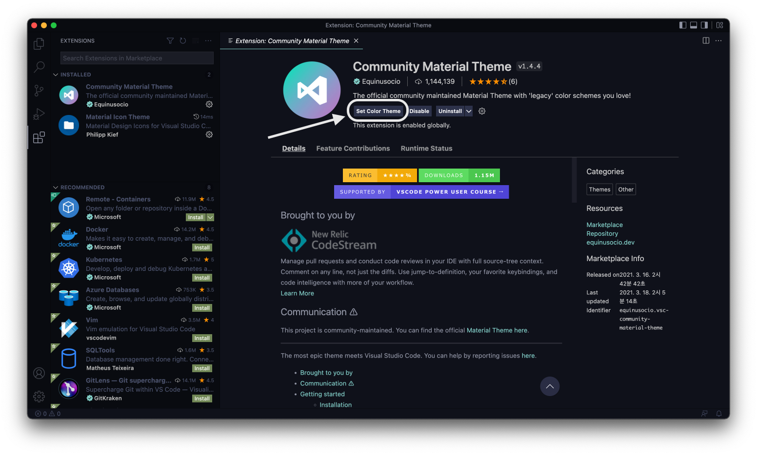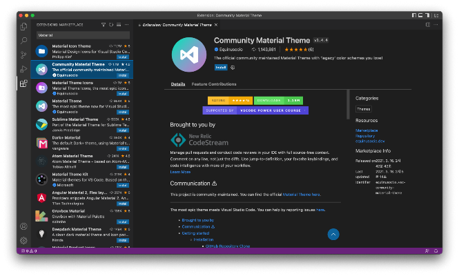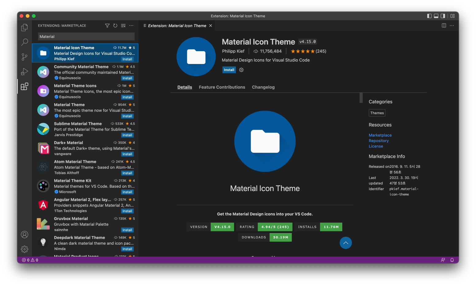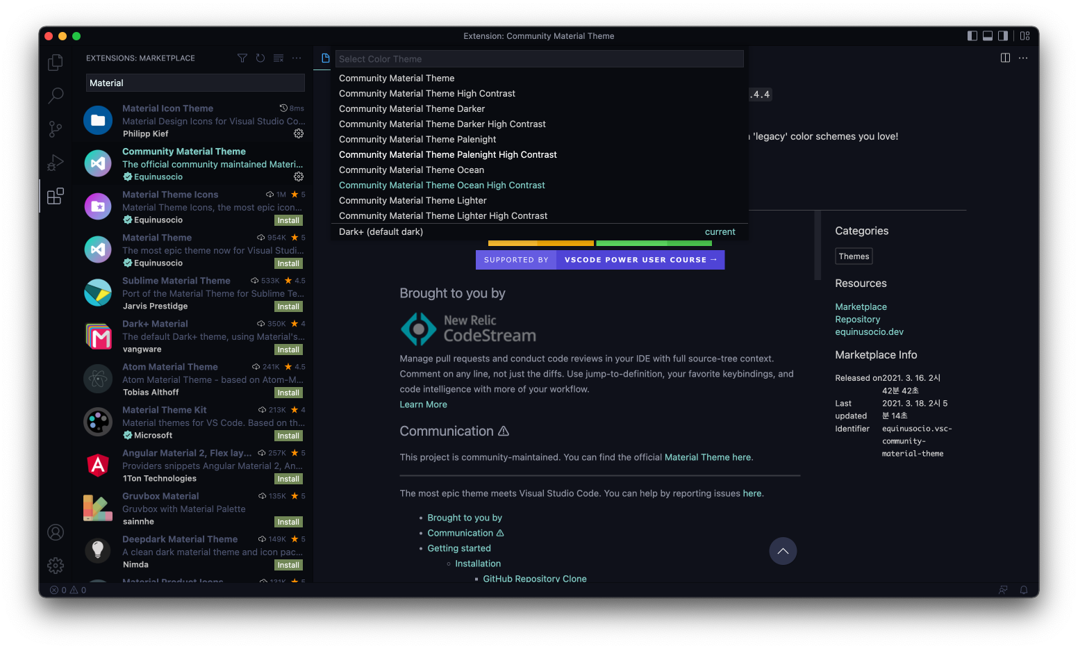 저는 여기서 Community Material Theme와 Material Icon Theme를 설치하도록 하겠습니다!