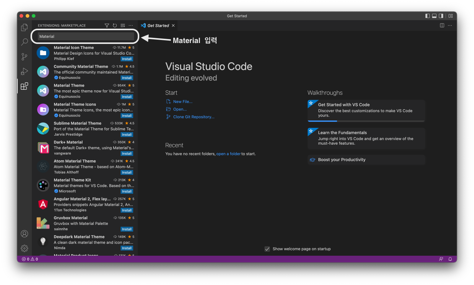그리고 플러그인을 검색하는 입력란에 Material을 입력합니다!