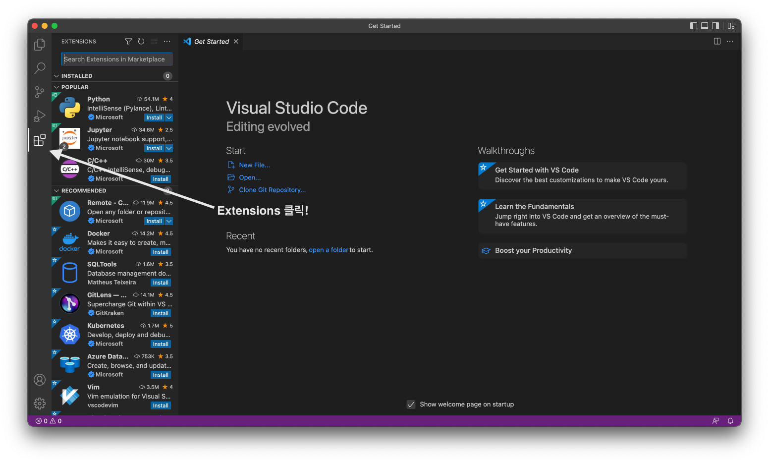 VS Code를 실행하고나서 왼쪽 메뉴 중에 Extensions를 클릭합니다!