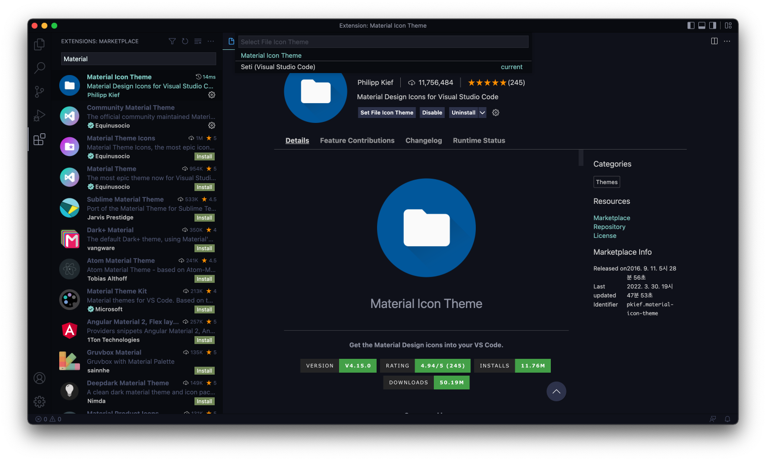 여기서는 테마가 한가지 밖에 없기 때문에 Material Icon Theme를 선택해주시면 됩니다!