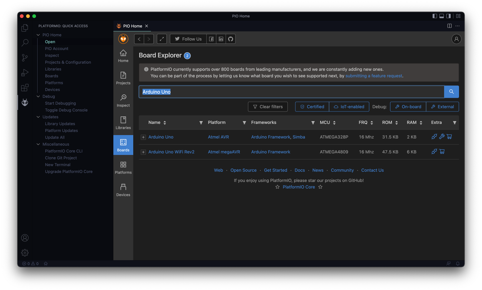 Boards에서는 PlatformIO에 등록되어 있는 보드를 검색하여, 세부정보를 확인 할 수 있습니다.