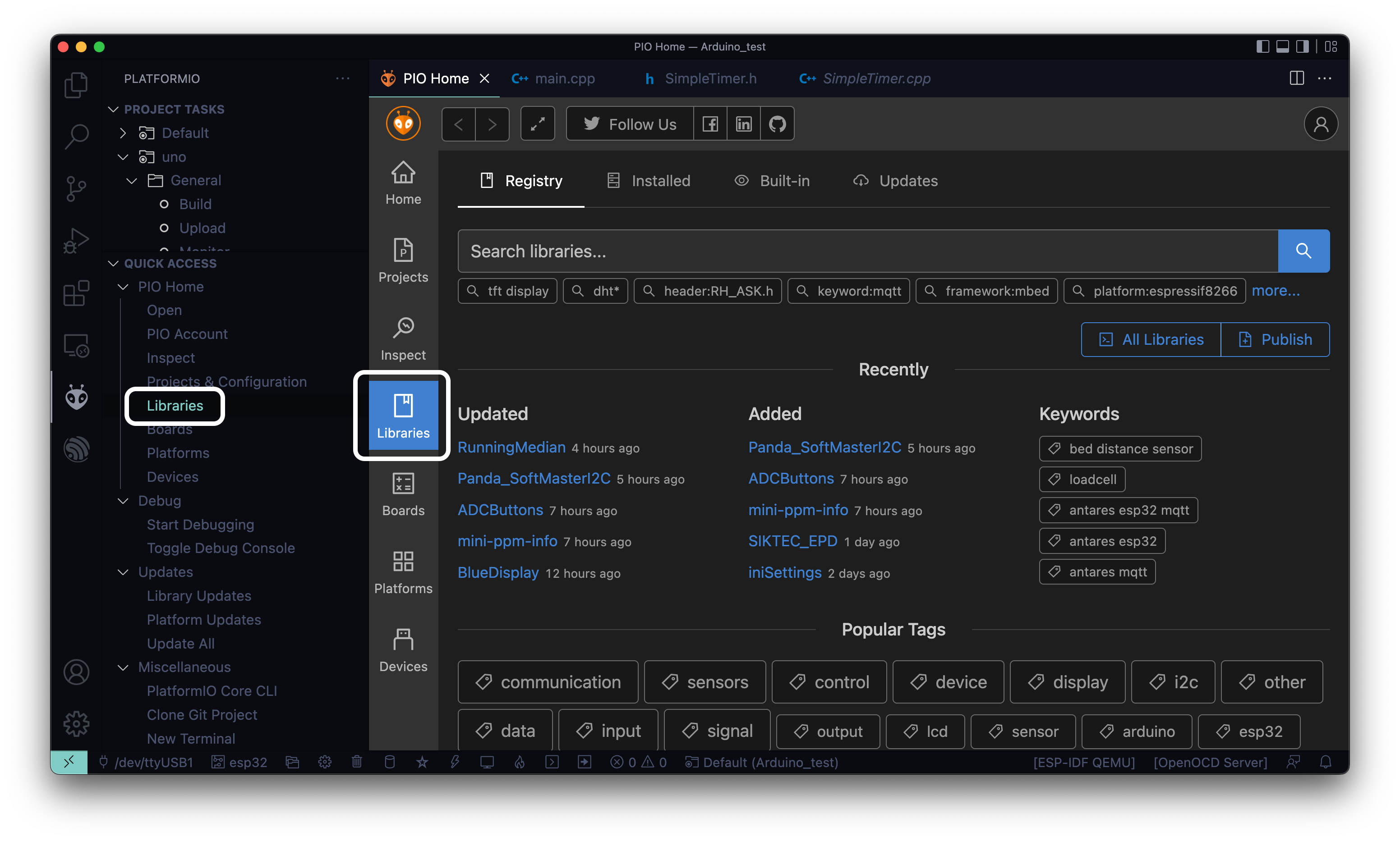 왼쪽 탐색창에 있는 Libraries 메뉴 또는 PlatformIO 홈 화면에서 Libraries 메뉴