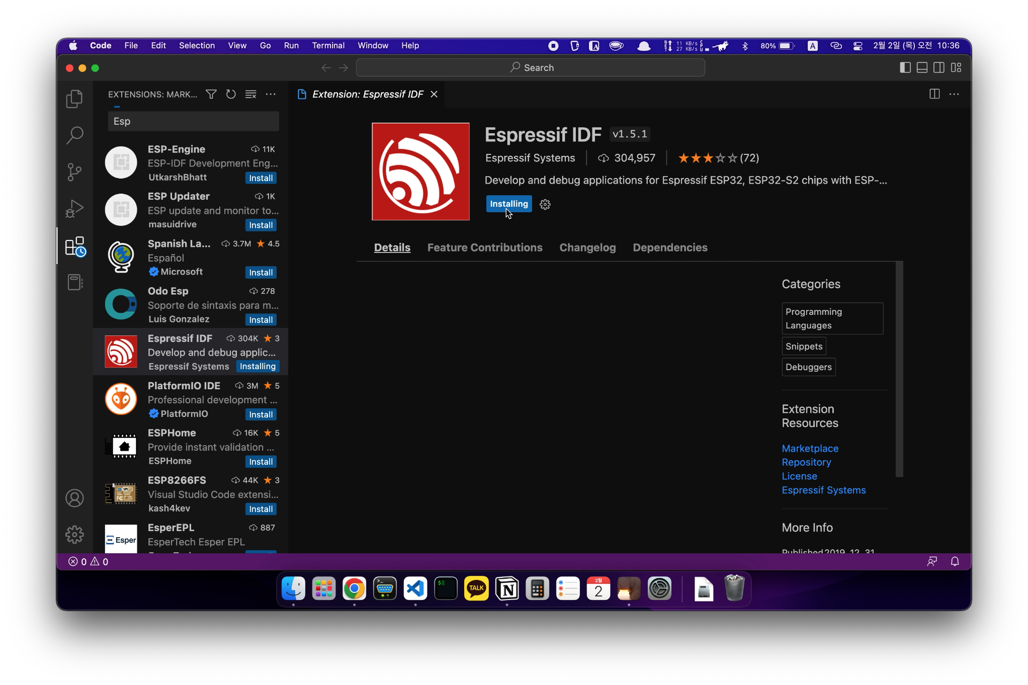우선 VS Code Extensions에서 ESP를 검색하시고 아래와 같이 Espressif IDF를 설치해주세요!