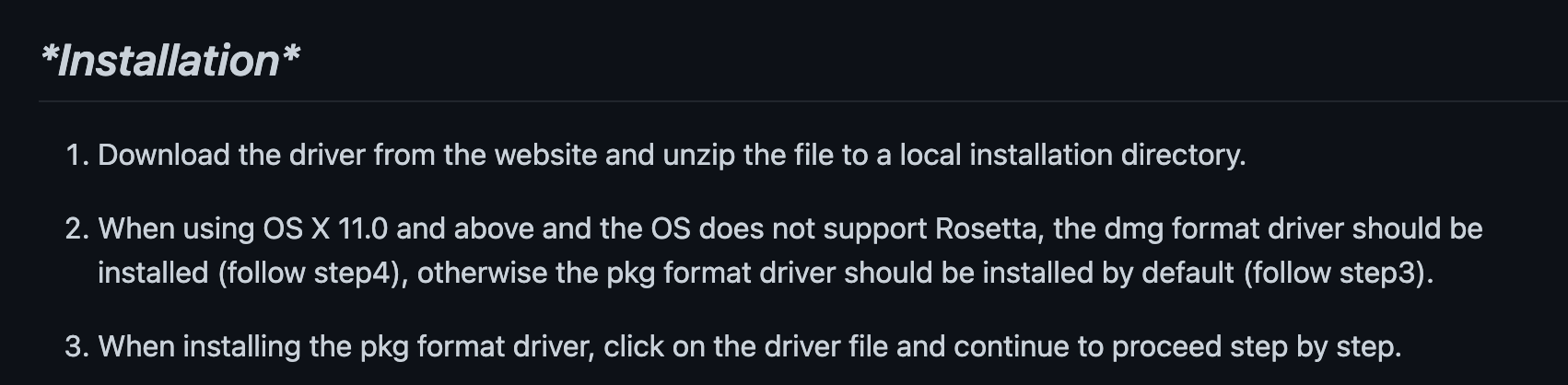 MacOS USB driver for USB to serial chip ch340, ch341, ch342, ch343, ch344, ch9101, ch9102, ch9103, etc - GitHub - WCHSoftGroup/ch34xser_macos: MacOS USB driver for USB to serial chip ch340, ch341, ...