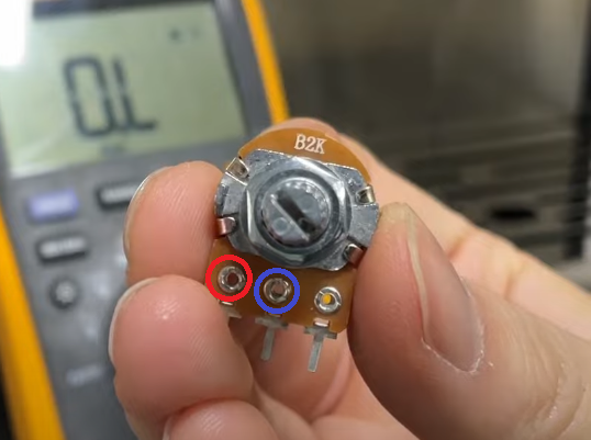 빨간 부분을 연결해주시면 중간에 가변저항을 끼워넣을 수 있습니다!