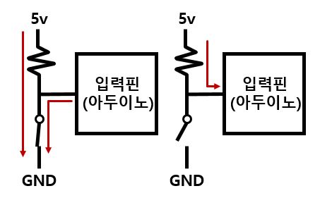 여기서 5v가 흐르게 될때 스위치가 닫혀 있는 경우에는 아두이노 측에서의 전류가 존재하기 때문에