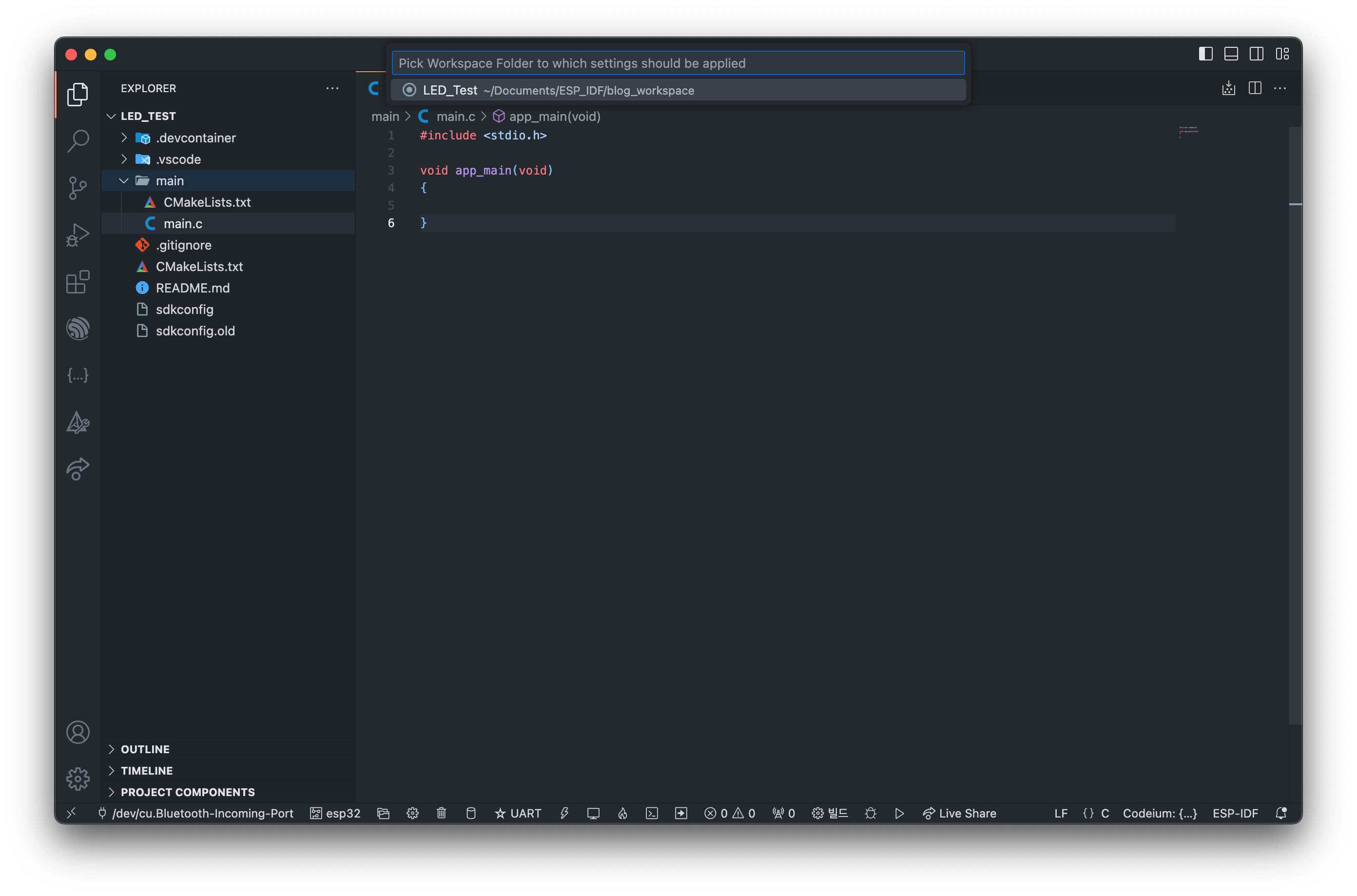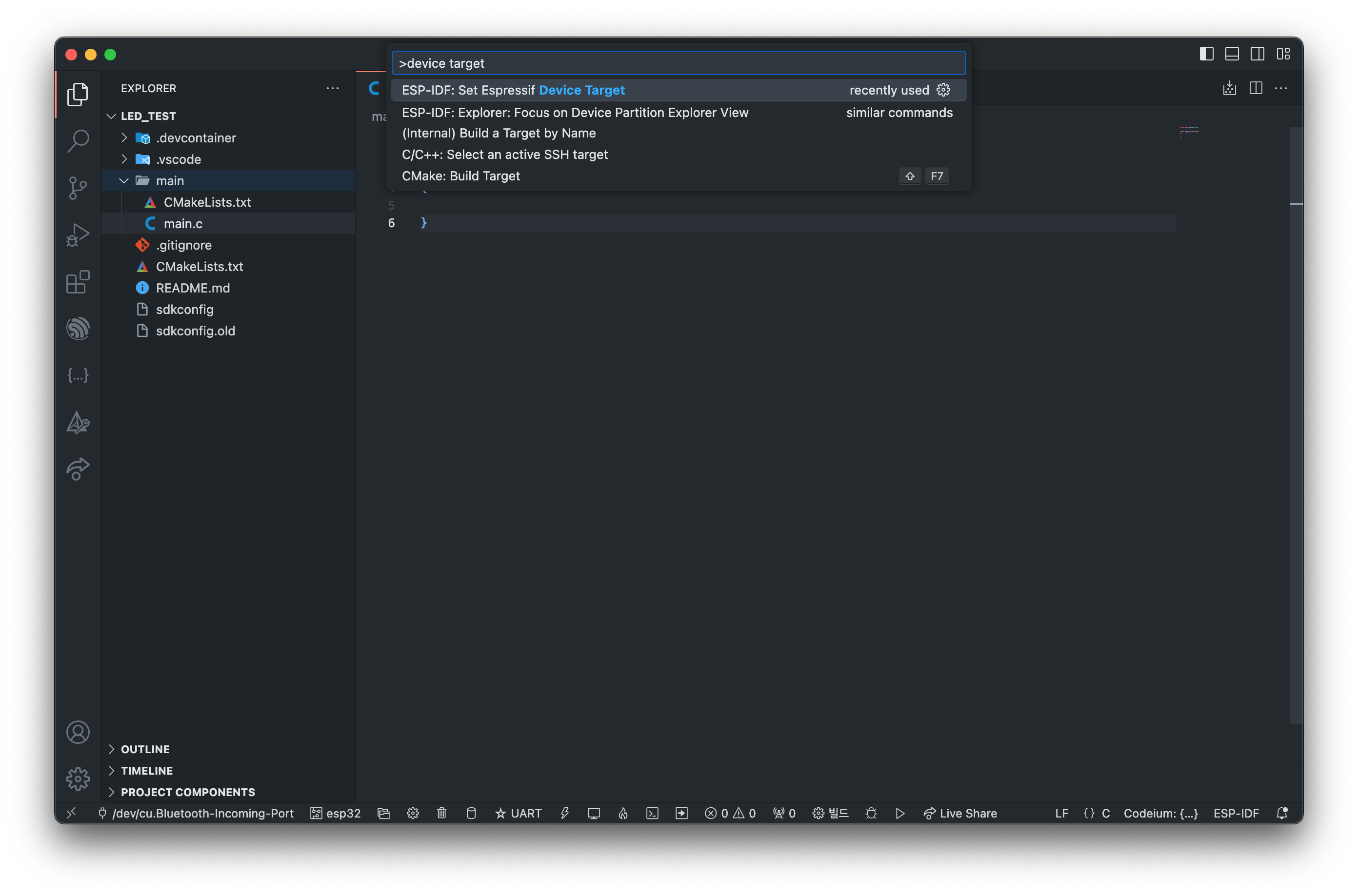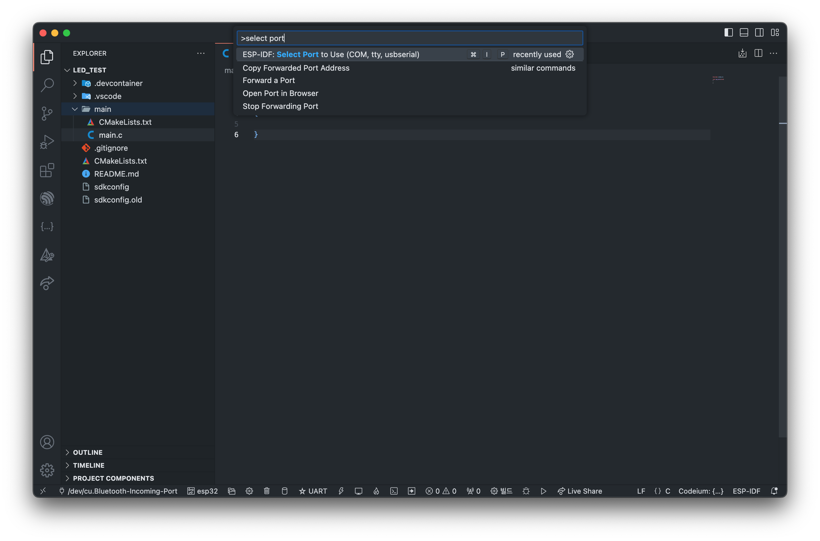 하단에 작업표시줄을 보시면, 현재 세팅된 port, esp-idf target을 확인 할 수 있습니다.