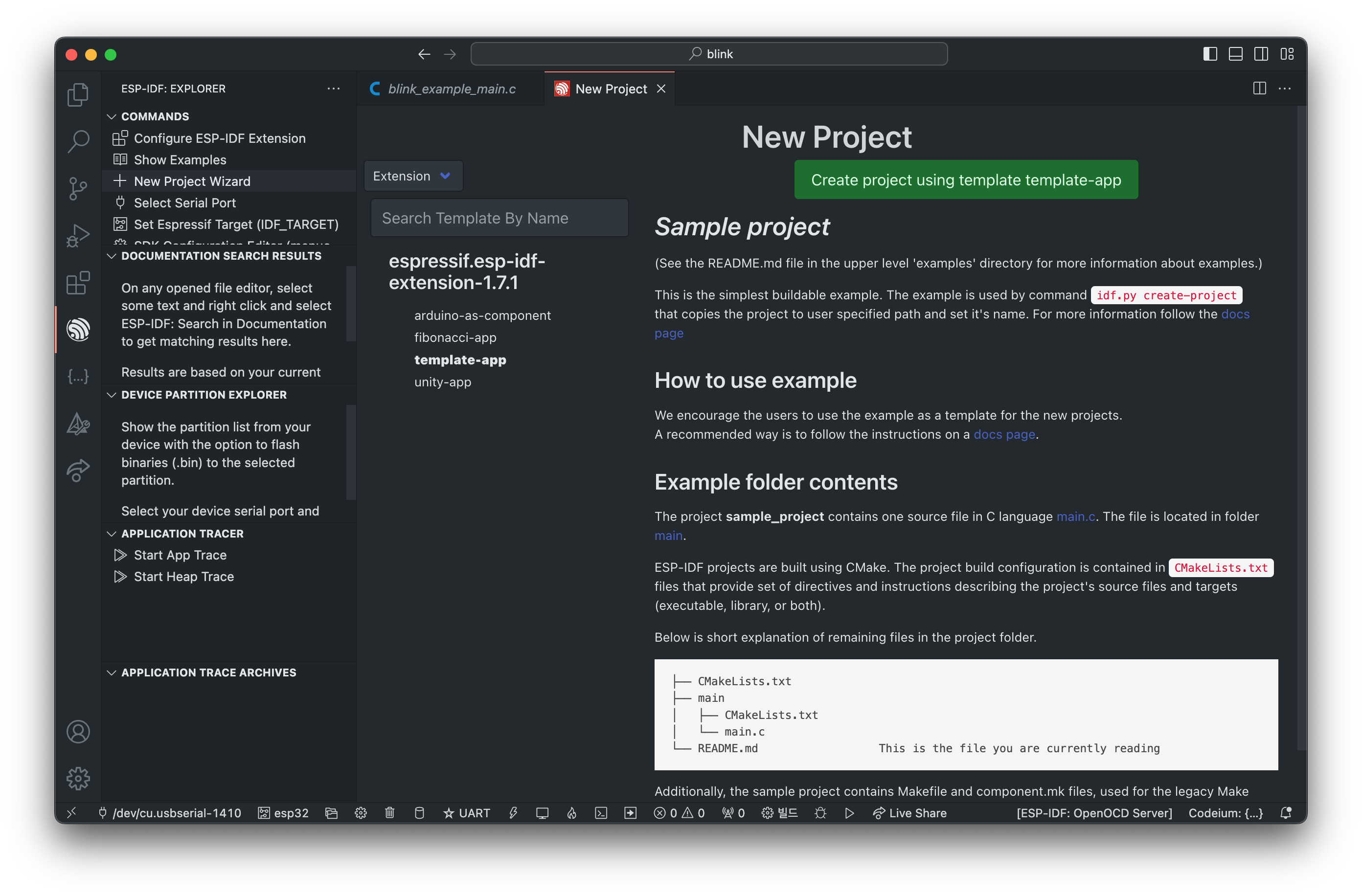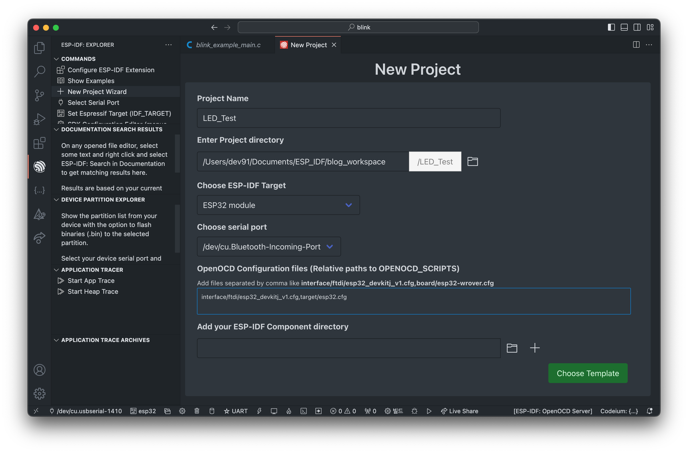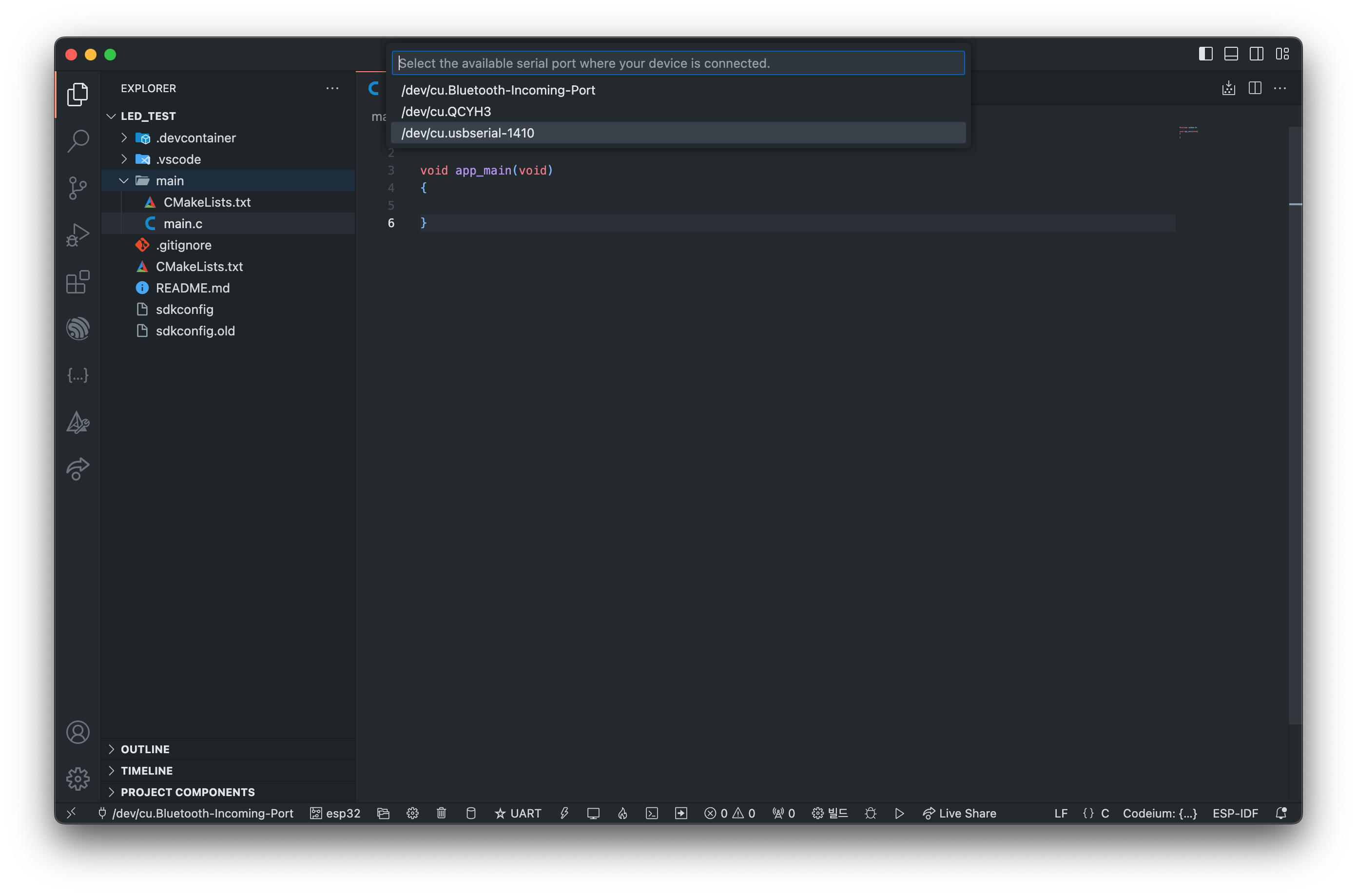 하단에 작업표시줄을 보시면, 현재 세팅된 port, esp-idf target을 확인 할 수 있습니다.