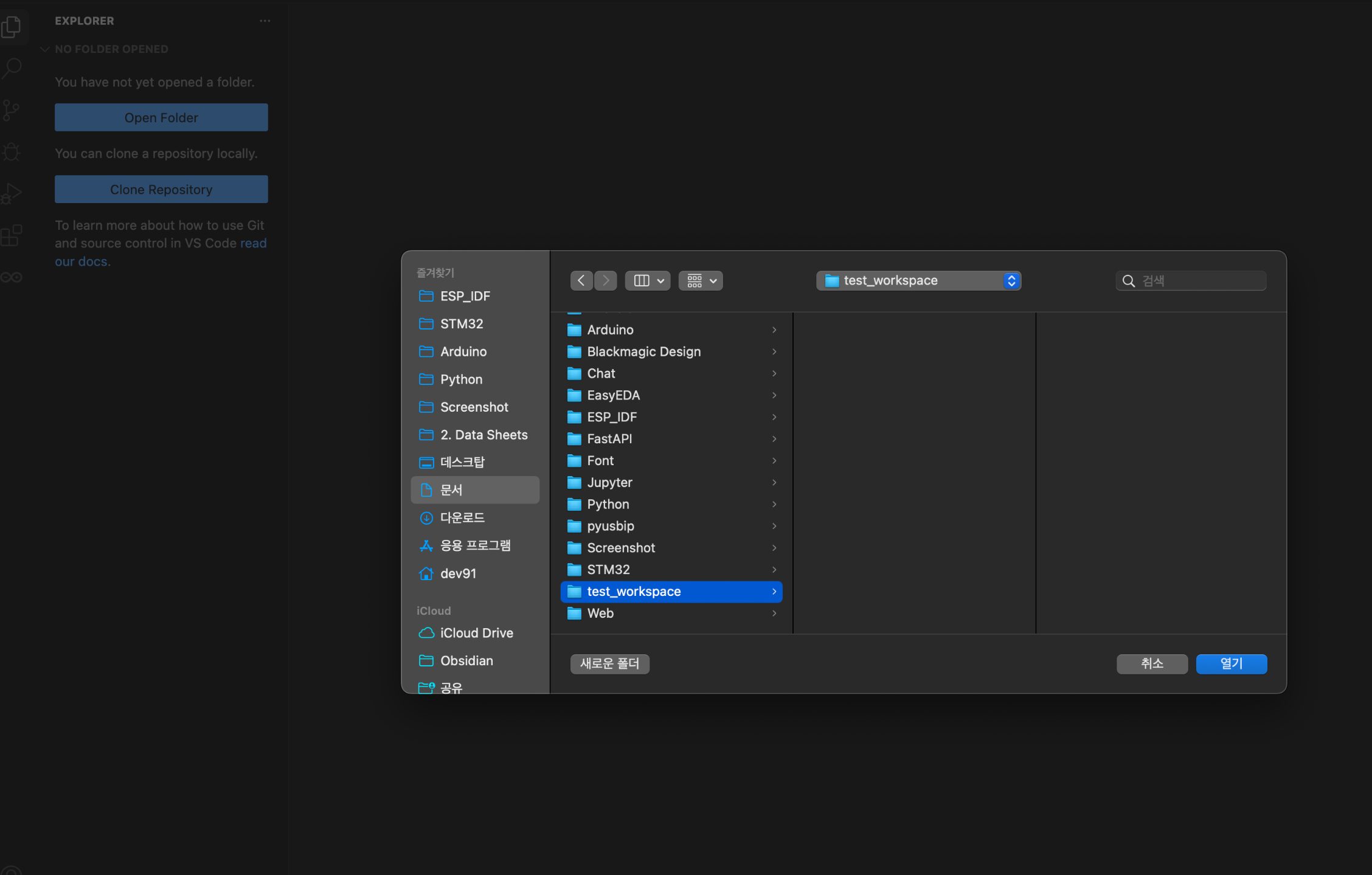 VS Code에서 workspace 폴더를 먼저 열어야 사용이 가능하니,