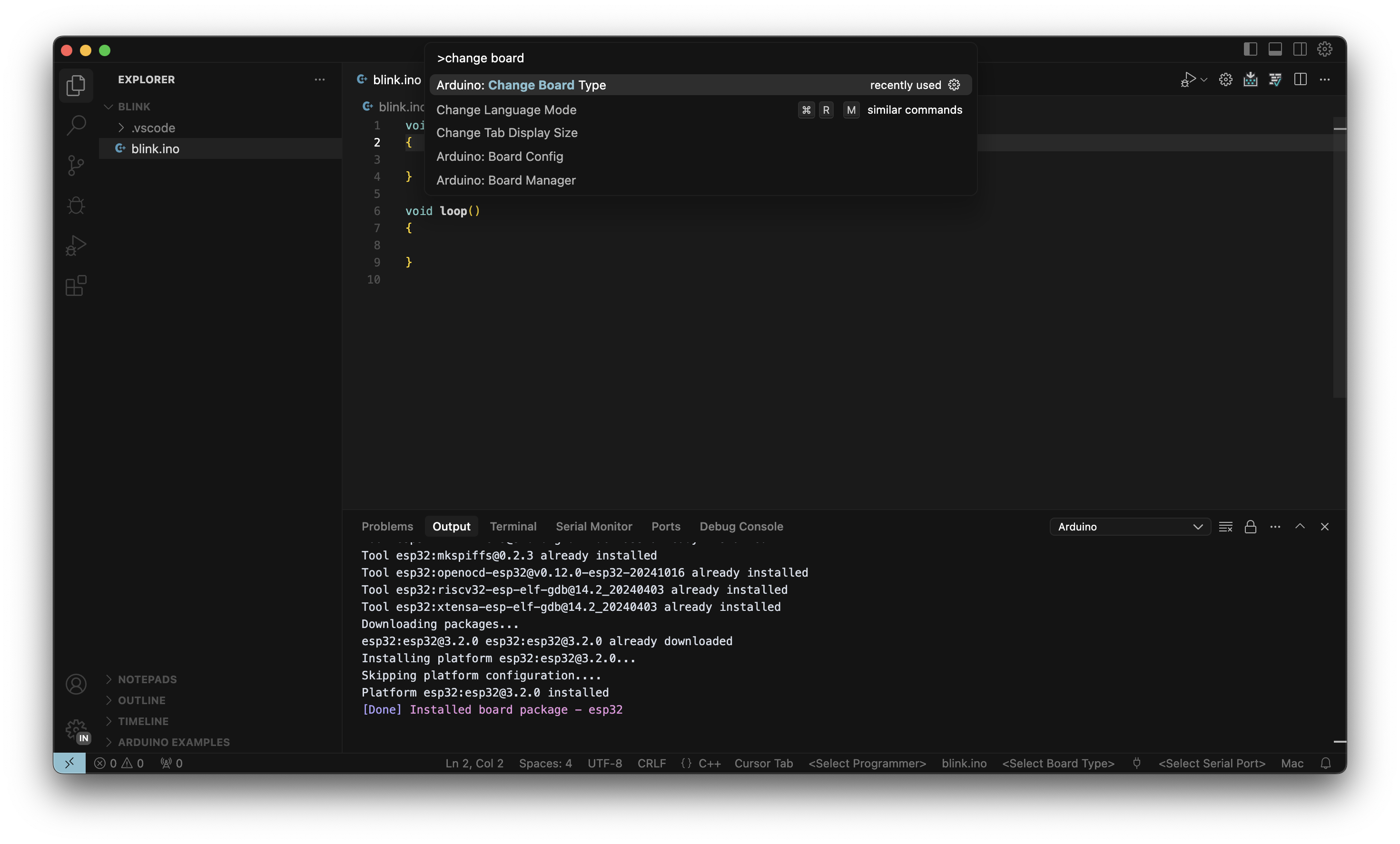 파레트에서 Arduino: Change Board Type를 실행해주세요!