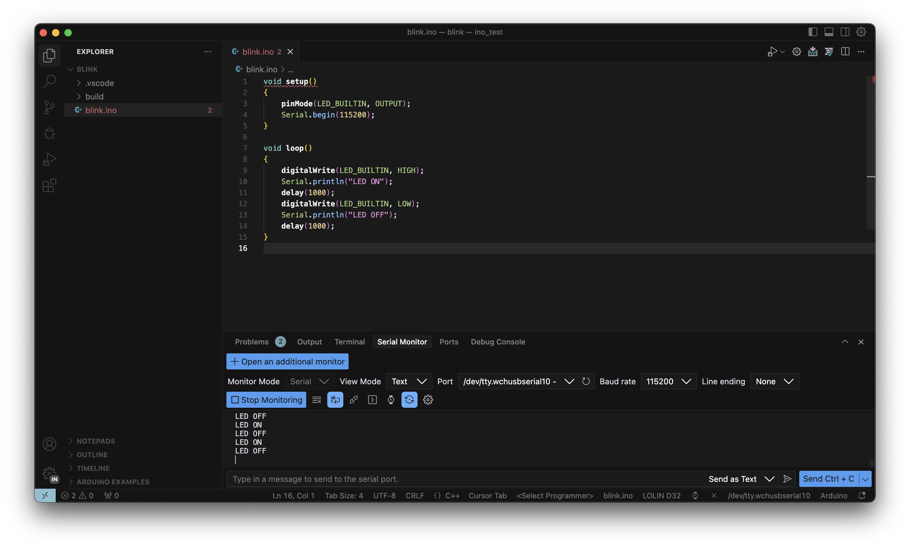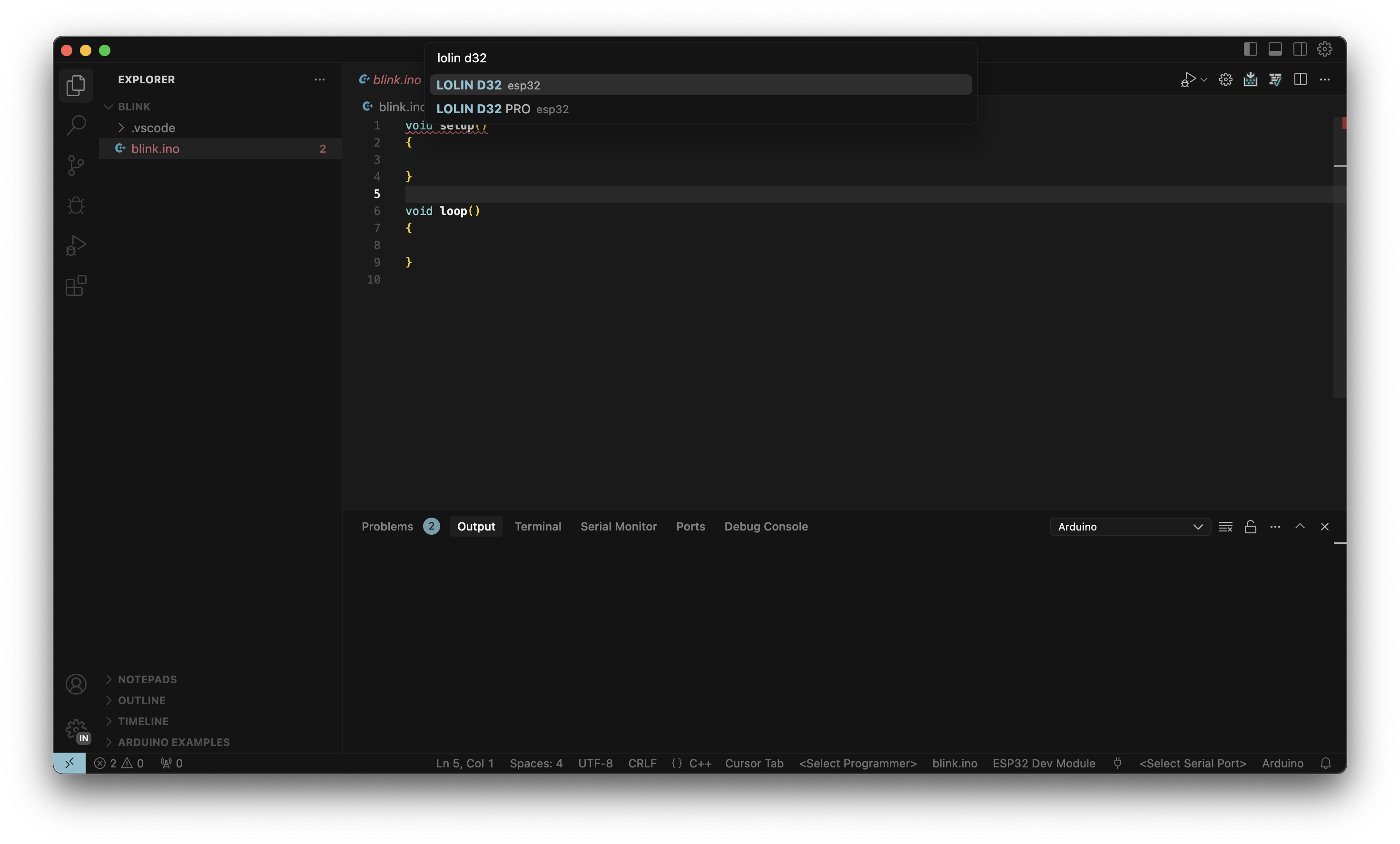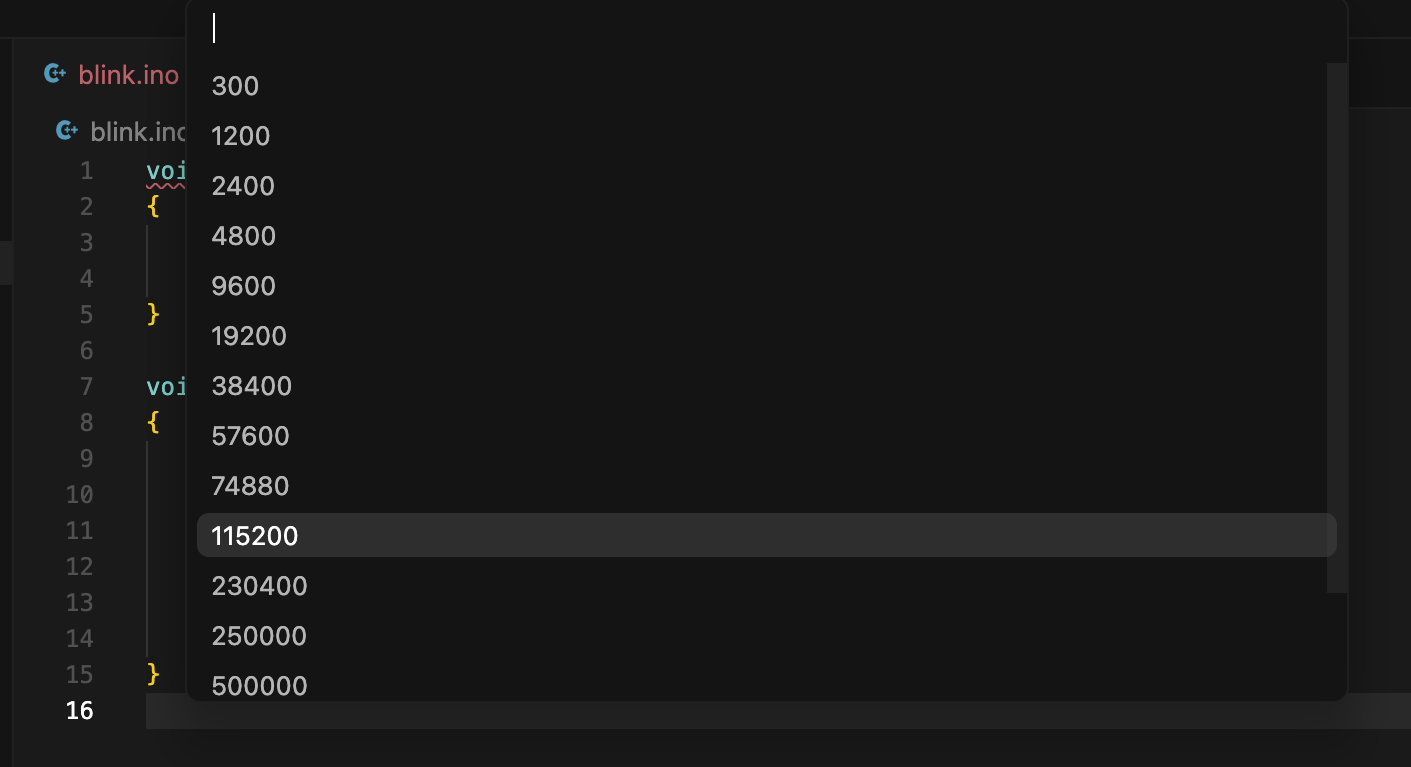 기본 blink.ino 파일이 생성되면서, setup()과 loop()가 보이게되고,