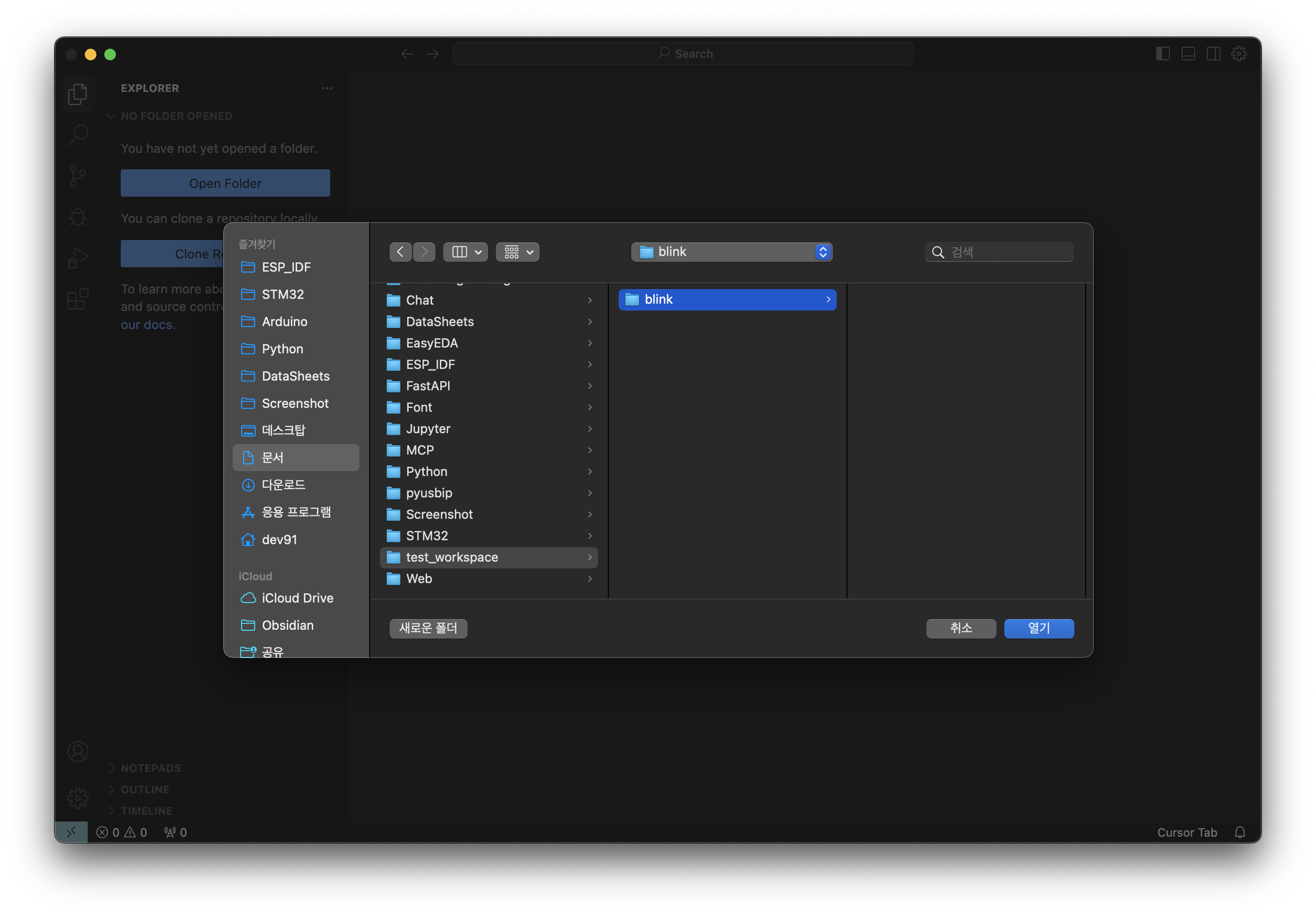 저는 blink 스케치를 만들 것이기 때문에 blink 폴더를 만들어서 열어주겠습니다.
