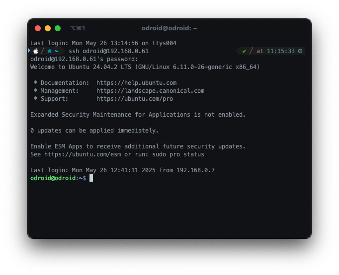 ssh odroid@192.168.0.61