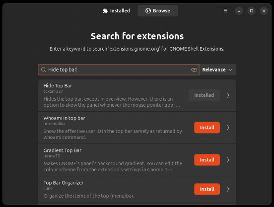 여기서 Borwse 탭으로 이동하고 Hide top bar를 검색해서 설치해줍니다!