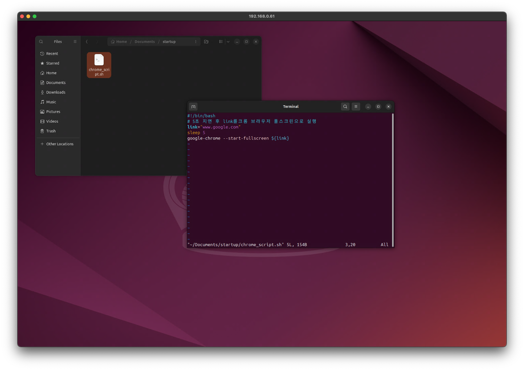 5초간 지연시간 후 link에 주소를 크롬 브라우저 전체화면으로 실행하는 쉘 스크립트를 구성해보았습니다!